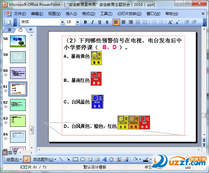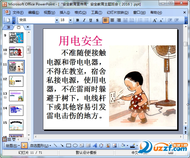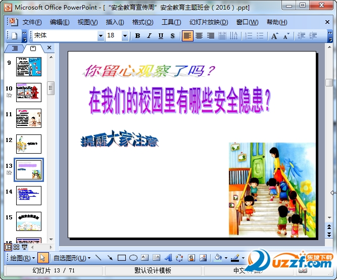 珍爱生命,健康成长,安全教育问题不容忽视,这份安全教育宣传周主题班会精品课件,总共有71页,每个安全问题隐患、小细节、情景都有演示,从交通事故猛如虎、课间安全、用电、校园、上下楼梯、打扫卫生、一个人在家注意安全等等情景都有提醒。非常的不错,直接点击下方的相应下载地址,就可以免费获得啦。
