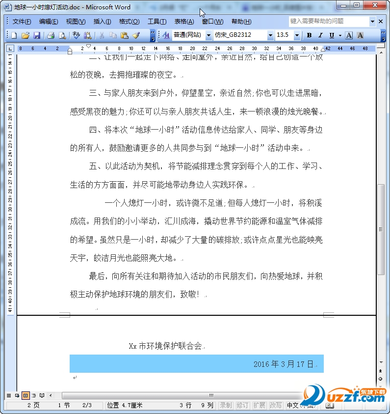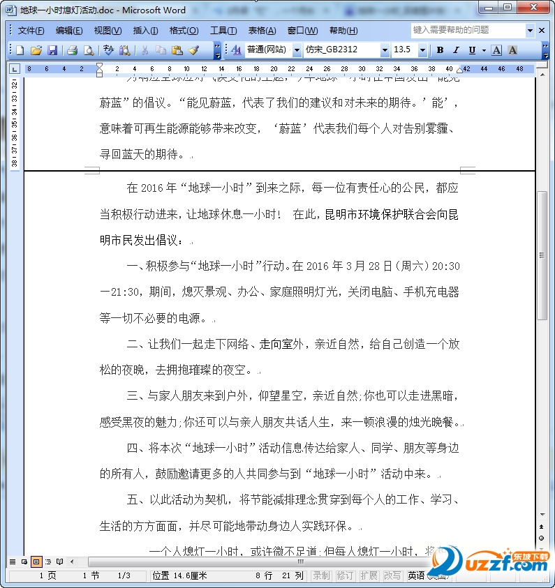环保!环保是我们现在非常关注也是不得不关注的一项话题,在即将到来的地球一小时日里,需要呼吁市民们进行熄灯一小时活动,这里我们东坡下载为各位朋友们带来的这篇地球一小时活动倡议书,有需要的可以来免费的下载使用!