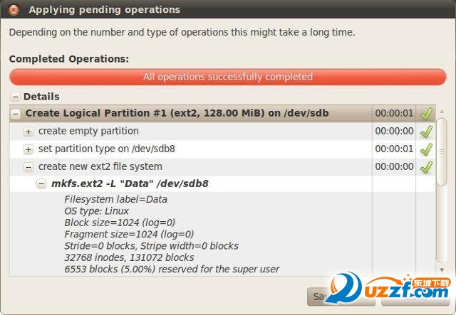 12、再次确认要调整分区容量后,gparted开始调整分区,完成后点“Close”按钮