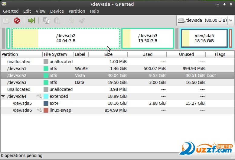 6、进入gparted,就会发现和瘟到死的PQ相似的界面,实际操作也是一样的,而且也支持瘟到死分区的调整