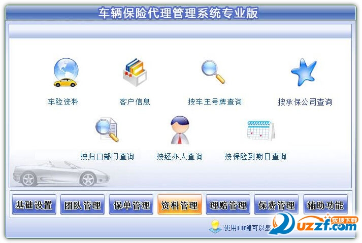 4.资料管理:车险资料,车险客户信息,按车主号牌查询,按承保公司查询,按归口部门查询,按经办人查询,按保险到期查询
