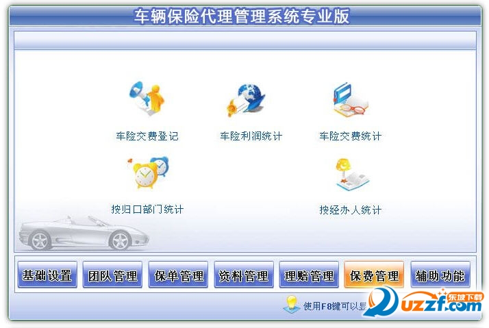 6.保费管理:车险交费,车险交费统计,保费按归口部门统计,保费按经办人统计,车险利润统计