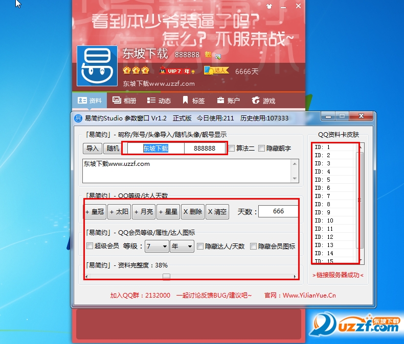 易简约QQ资料卡装逼软件其实就是一款功能非常强大的QQ资料卡修改软件,修改你的昵称账号,皮肤,会员等,让你逼格提升,屌丝也能变土豪。