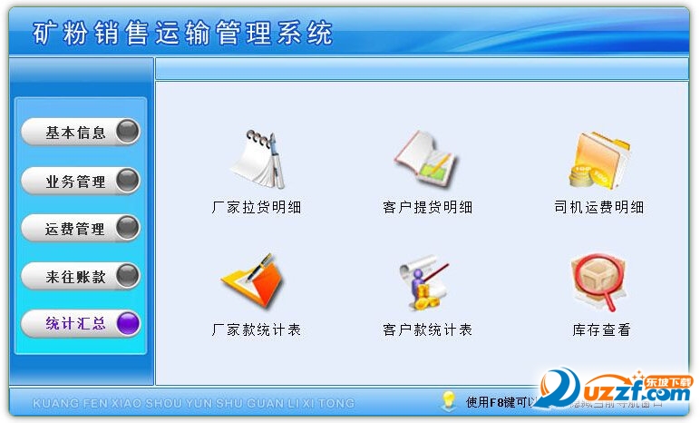 5.统计汇总:厂家拉货明细、客户提货明细、司机运费明细、厂家款统计、客户款统计、库存查看 。