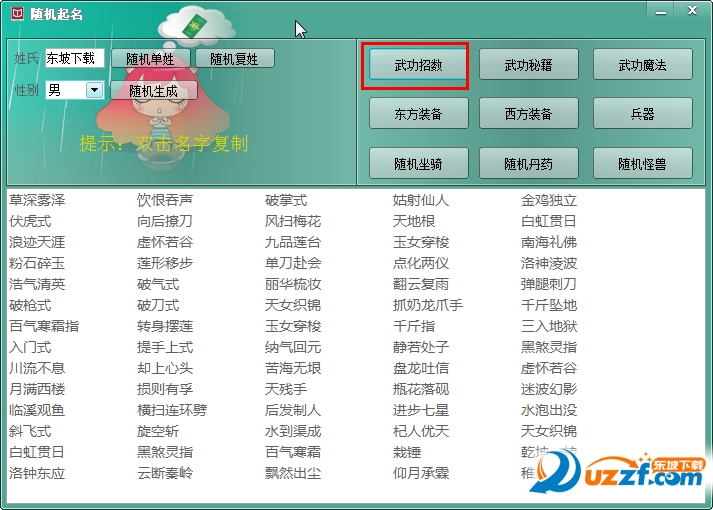 这款随机起名软件是专为写手打造的一款小说写作神器,可以生成大量的男女姓名,武功,秘籍,兵器,坐骑等,让你再也不用为取名而烦恼了。