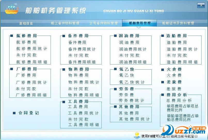 主要包括:合同登记、船修费用、厂修费用、备件费用、物料费用、工具费用、润油费用、氧乙炔、劳务费、差旅费、其它费用、造船费用、伙食费、事务提醒、费用分析。