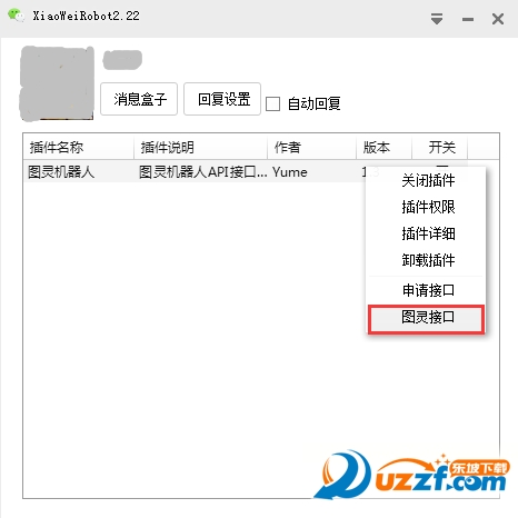 <5>开启图灵插件后,点击“图灵接口”来修改配置信息。即把第二步获取的图灵key值复制粘贴到下图的”图灵接口ID”文本框中来替换默认初始值key(使用个人key即可在NLP中导入私有词库,让机器人按照自己的词库来回答),点击“确认”即更改成功。