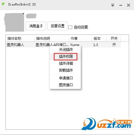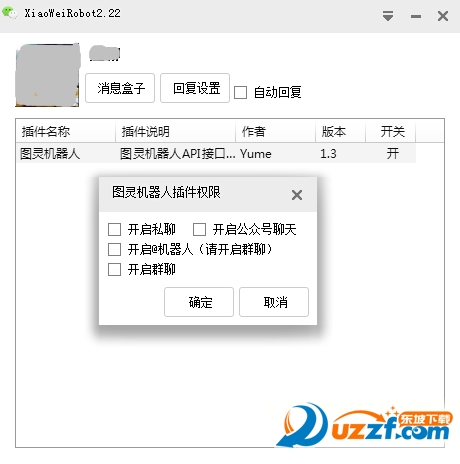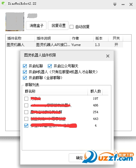 <6>点击“图灵机器人”并选择“插件权限”,在弹出的“图灵机器人插件权限”窗口中,所有的功能设置(私聊、群聊、公众号聊天、@机器人)默认为关闭状态。开启群聊功能后,群聊列表中将会自动显示出你的微信群(微信群最好设置成“保存到通讯录”),并勾选想要使用的微信群。建议群聊时开启@机器人功能来唤醒机器人。