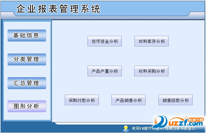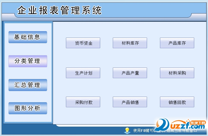 2.分类管理:货币资金,材料库存,产品库存,生产计划,产品产量,材料采购,采购付款,产品销售,销售回款。