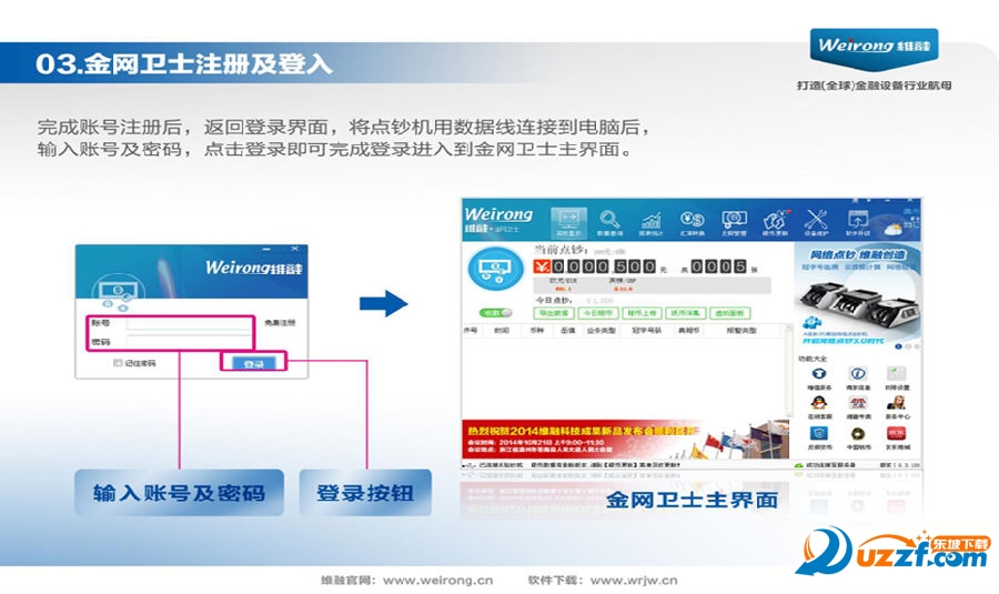 8、“维融金网卫士”软件系统为银行等集团大客户提供全新的用户使用人民币点验钞机物联网解决方案,实现更加现代的货币流通管理与更有力的反假货币利器。