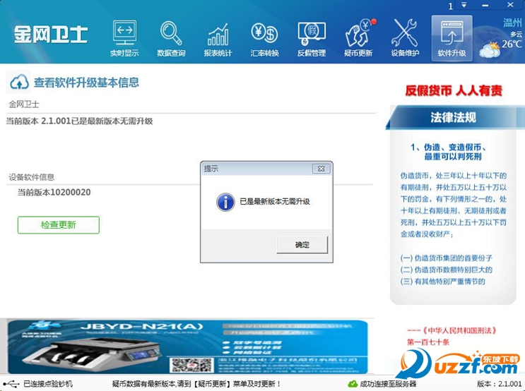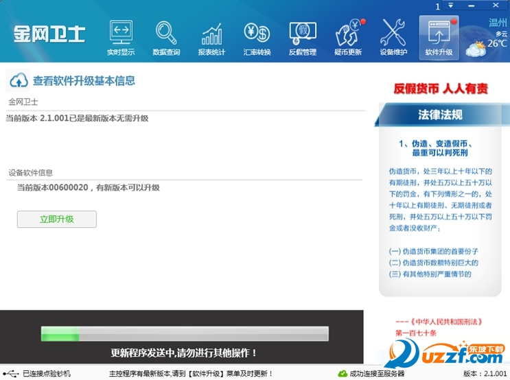 1、“维融金网卫士”软件系统对具物联网功能的A级点验钞机显示内容可以同步在电脑上记录并通过显示器显示,记录的数据,可以进行统计、上传及权限查询。