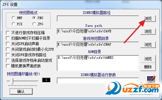 直接运行“zfe_cn.exe”,然后会出现下图设置界面:点击【浏览】,选择ZSNES模拟器的路径,也就是“zsnesw151”这个目录
