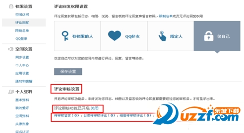 3、在页面的右边我们可以看到有四种权限设置,第一种和第二种很简单大家一看就明白,如果选择并【保存设置】的话,不是QQ好友和没有权限的人是无法对空间的内容进行评论、回复和留言的。