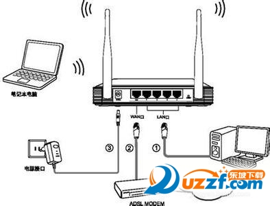 2、连接路由器到开联网,按下图蓝色网线所示,一端插入ADSL Modem的LAN口或者其他互联网接口,另一端插入路由器的WAN口。