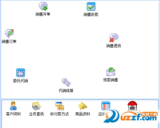 销售订单、销售出货、销售退货、销售付款、委托代销、现款销售。