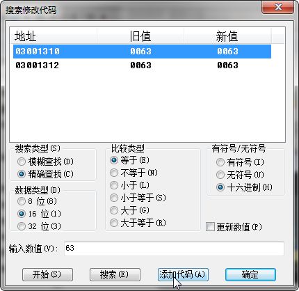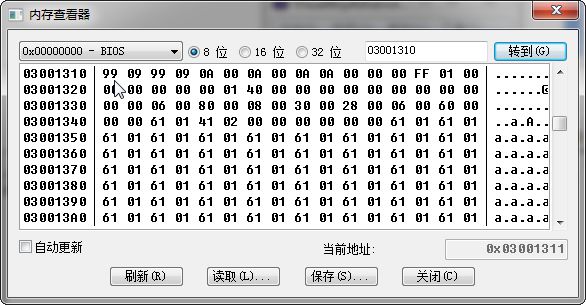 输入需要查看的地址,比如我们之前搜索出来的03001310,然后点击"转到"。发现了吧,之前我们修改的999的位置就在这里了,我们可以手动修改这里的任意数字。在将来你对修改更有心得之后,你会发现这里是一个非常好用的工具。