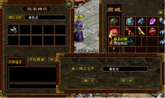 2.点击亲自摆摊进入摆摊页面。系统将自动弹出玩家摊位对话框和包裹对话框,将您想出售的物品点击拖到摊位方格后,系统自动跳出物品价格窗口。