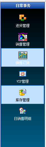 1、日常事务:进货管理、销售管理、销售订货、VIP管理、库存管理、日销售明细