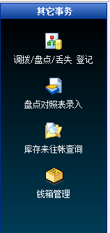 2、其他事务:登记信息、盘点对照表录入、库存来往帐查询、钱箱管理