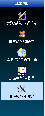 4、基本信息:服装信息设定、品牌设定、票据打印、数据库备份和恢复