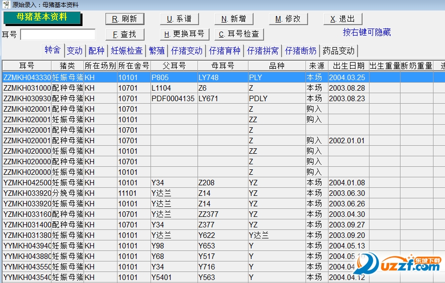 此模块完成猪场所有相关数据如种猪档案、存栏情况、配种记录,繁殖记录、猪群变动记录、转舍记录、仔猪育种、仔猪拼窝、仔猪断奶、饲料变动、药品变动、易耗品变动记录的增加、删除与修改。