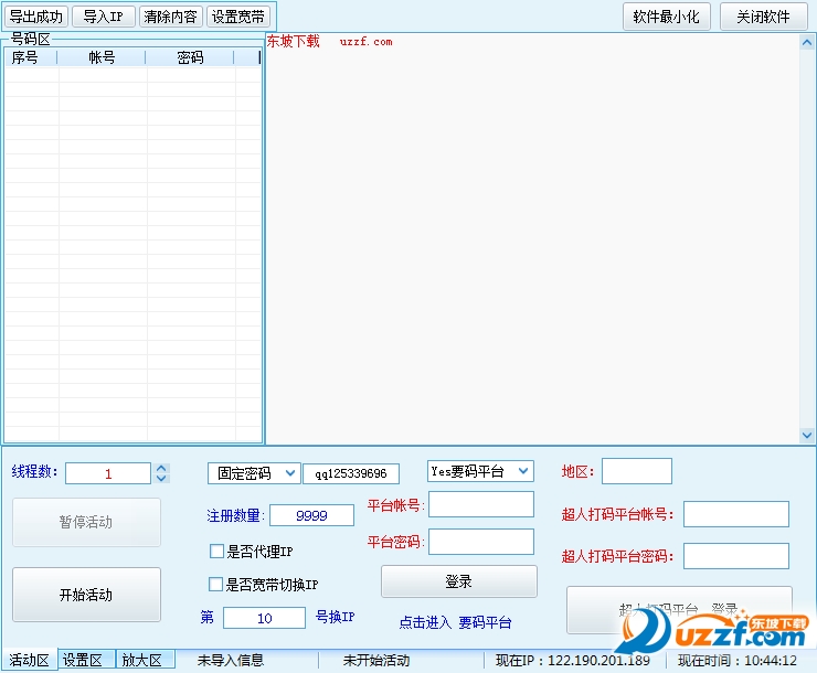 软件使用也很简单,设置好密码、打码平台、账号注册数量、自动换IP等信息后,点击左下角【开始活动】即可正常注册百度糯米的账号。