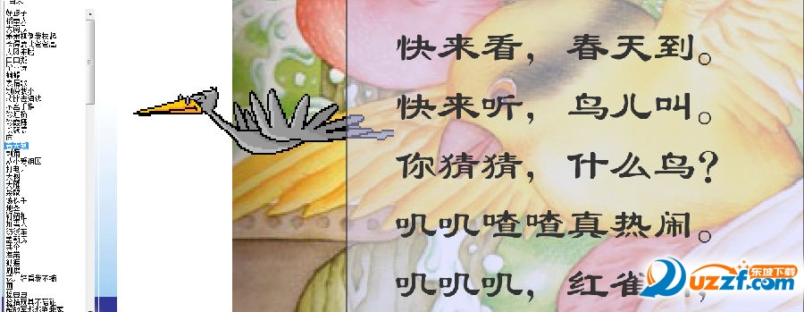 该软件共包括拔萝卜、板凳绑扁担、编花篮、不倒翁、十二属相歌、什么弯弯、小老鼠上灯台、摇啊摇等经典童谣和现代童谣。动画制作非常精美,儿歌简单易学,对儿重思想品德的形成、美好情感的培养、行为习惯的养成、中华民族语言美感的熏陶,乃至孩子开朗乐观的人格塑造都有着潜移默化、无可替代的作用。