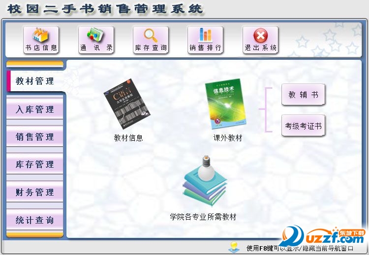 5.库存管理:教材总库存查看、现存书籍查看、库存预警、教辅书库存查看、考级考证库存查看、非寄卖书籍库存、寄卖书籍库存。