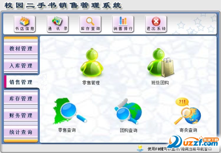 4.销售管理:零售管理、班级团购、零售查询、团购查询、寄卖查询。