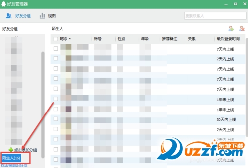进入好友管理器,将左侧好友分组拉直底端,可看到陌生人分组。这里的陌生人就是你的单向好友。