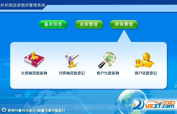 3.财务管理:欠供商货款查询、付供商货款登记、客户欠款查询、客户还款登记。