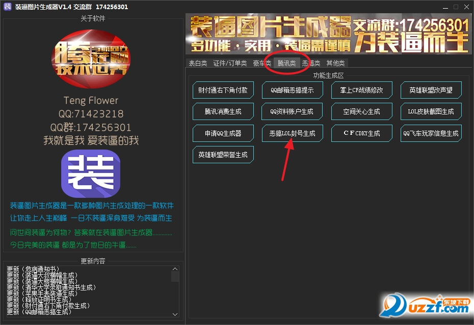 下载解压后,运行软件,选择“腾讯类”,点击“恶搞LOL封号生成”