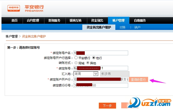 点击【账户管理】下【资金转出账户维护】,点击【新增】,按提示输入信息。(平安易宝账号只能绑定其他银行同名账号)