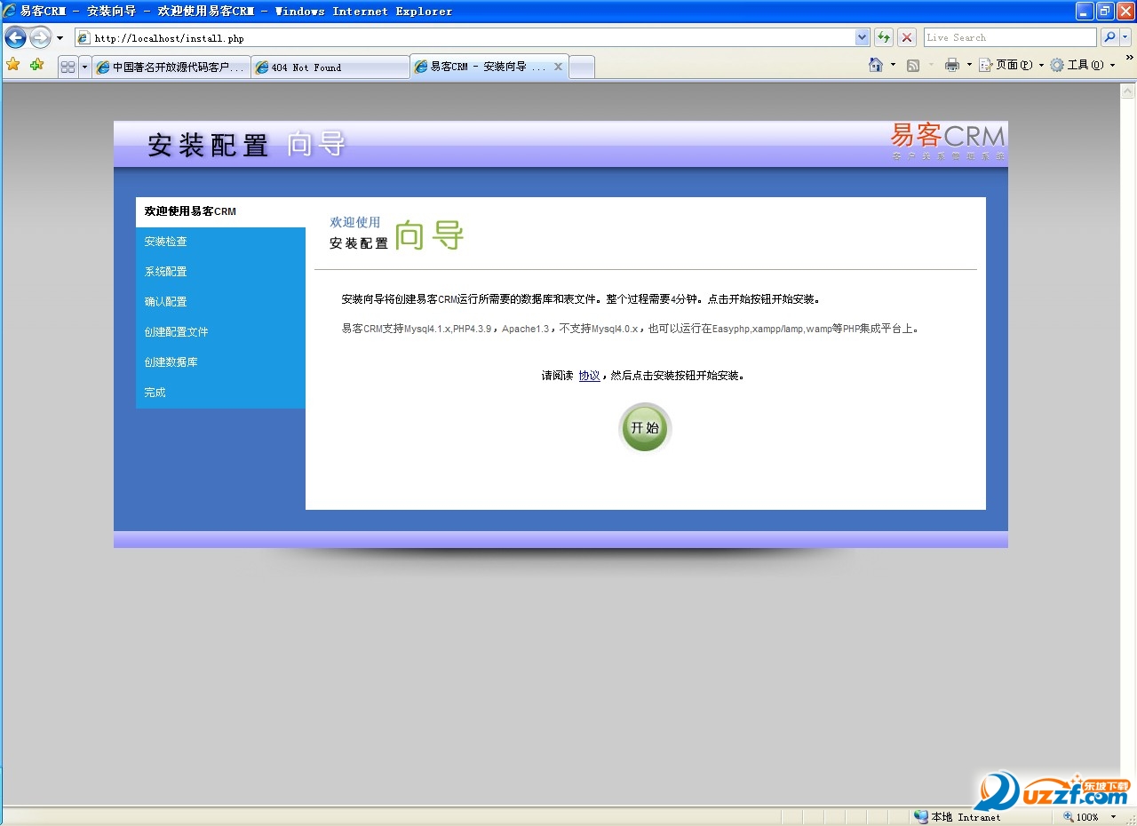 下面打开http://localhost/install.php进行安装,如下图,点击开始。