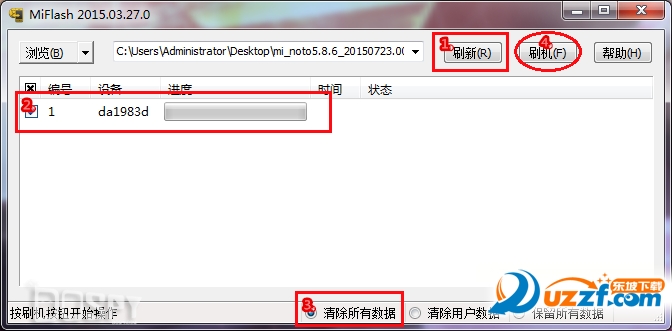 5. 打开小米线刷工具,选择刚刚下载的NOTO包,点击刷新,选定右下角的“清除所有数据”再点刷机!