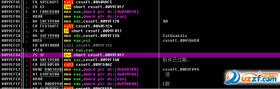 可以发现前面有个jnz,改为jmp跳过软件过期。之后打两处修改地方的补丁。