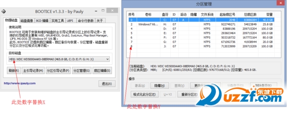 打开BOOTICE,查看你的硬盘序号和分区序号!记下那两个数字,替换上文中的root (hdX,Y)