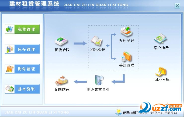 系统具体包含了基本资料、租赁管理、库存管理和财务管理细四大模块,界面简洁、菜单功能一目了然,只要您用鼠标轻松一点,即可查询库存、未还等情况、统计租金、欠款等情况等,方便建筑材料租赁统计分析,获取策。本管理系统多处具有快速辅助录入功能,操作简单,易学、易用;处理功能高效强大,是协助建筑材料租赁行业的好帮手!