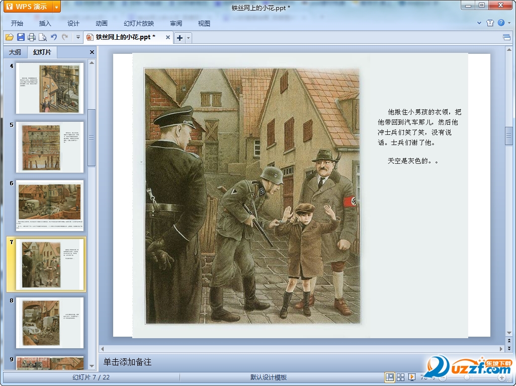 这是一本以二战时期德国为背景一篇绘本故事,描绘出犹太人在二次大战纳粹极权下的悲惨遭遇,给读者带来强烈的心灵震撼,让孩子认识善良、纯真和爱心的故事,对孩子们的成长阅读很有帮助的一本绘本,有兴趣的老师家长们可以来下载这篇铁丝网上的小花绘本为孩子们阅读!
