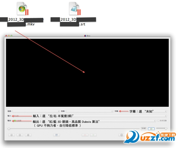 開啟 Bino 3D 軟體,將 Blu-ray 3D 影片檔與 3D 編碼字幕檔,同時直接拖入黑畫面內後,按圖索驥。