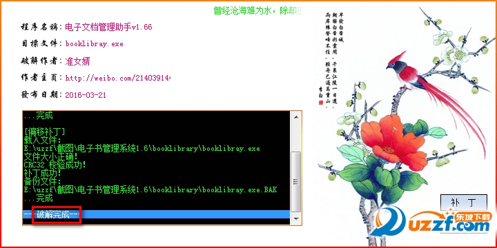 然后将“电子文档管理助手v1.66-patch.exe”运行,点击“补丁”下面会显示破解完成
