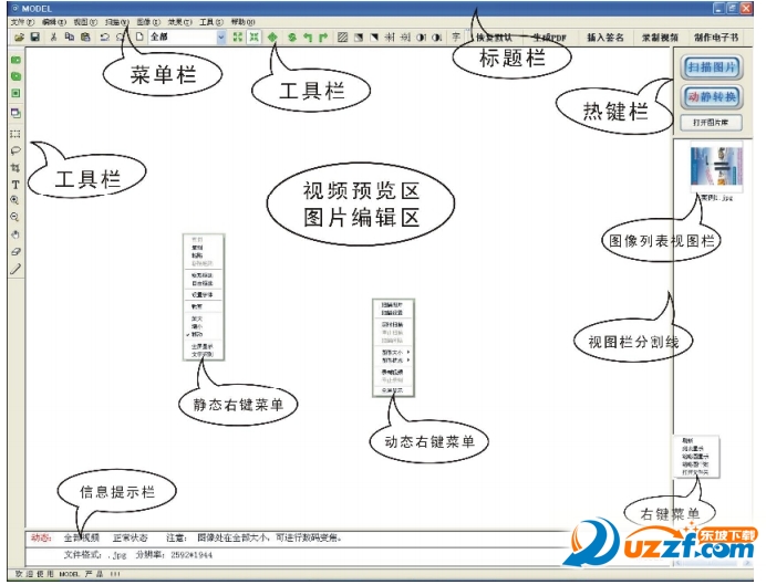 视频预览区、图片编辑区、右键菜单和视图分割线等组成,如上图所示。