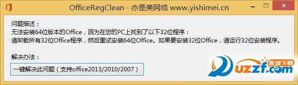 OfficeRegClean可以完美解决安装office2013/2010/2007 64位版本时出现“无法安装64位版本的Office,因为在您的PC上找到了以下32位程序”的问题。