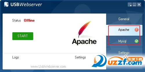 1、下载解压缩USBWebserver后(下载地址在文章未),可将其移动至任何硬盘、文件夹或便携USB上任何位置,但是文件存放路径最好不要包含中文,否则Apache伺服有可能会启动失败。移动完成后直接双击运行“usbwebserver.exe”程序文件。usbwebserver.exe 运行后会自动启动Apache及Mysql,看到二个都打绿色勾时表示没问题,如下图所示: