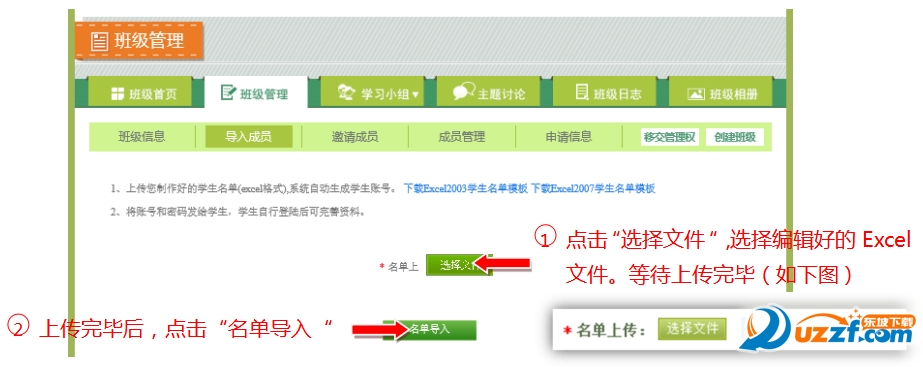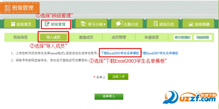 2、在“班级管理中”,进入导入成员页面,下载导入表格。
