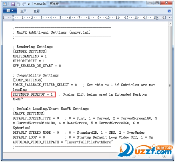 2.修改MaxVR文件夹中maxvr.ini文件(右键用写字板打开,非记事本)将“EXTENDED_DESKTOP = 0”改成“EXTENDED_DESKTOP = 1”。(如图)