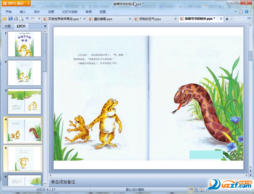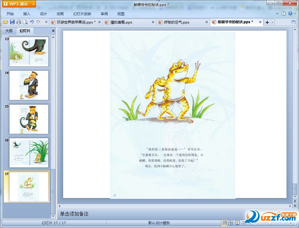 我们东坡下载站为各位老师家长们准备了大量的绘本故事下载,这里的这篇蛤蟆爷爷的秘诀绘本故事(共17页)内容完整精美,里面的文字也是十分清晰,有趣的故事剧情肯定手孩子们的喜欢,有需要该绘本ppt的可以来我们这里免费的下载!
