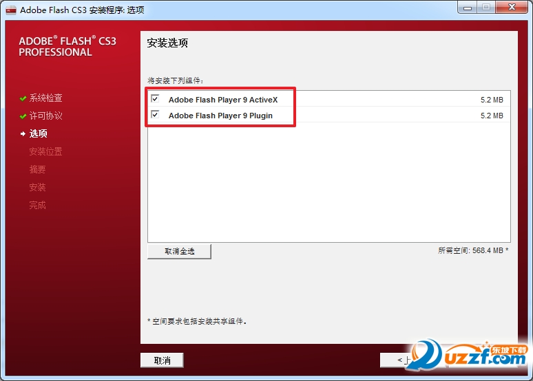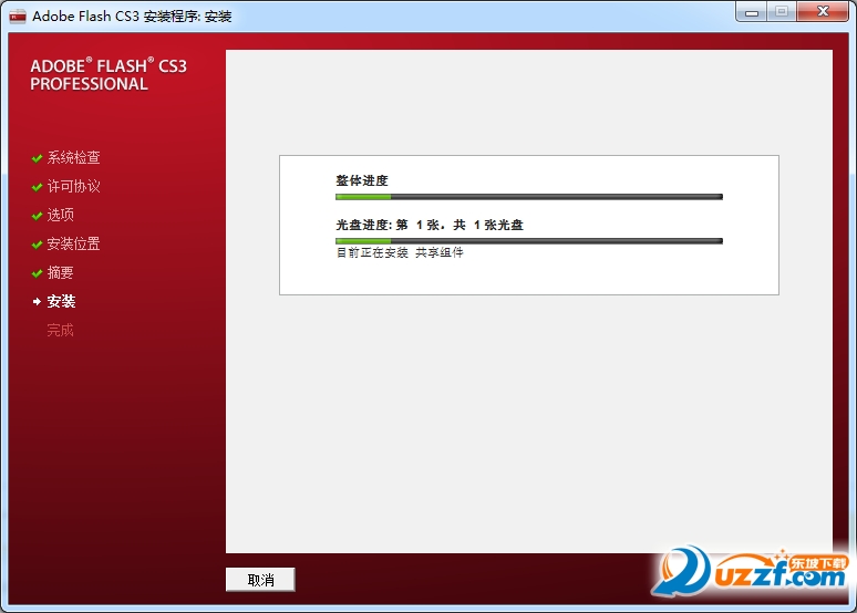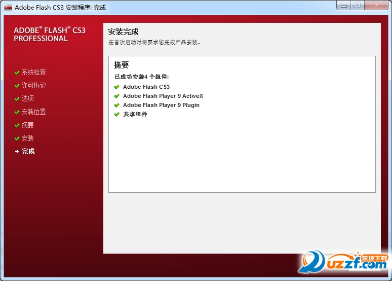 打开安装Adobe Flash CS3中文安装界面,第一步系统检查,自动跳过了此步骤