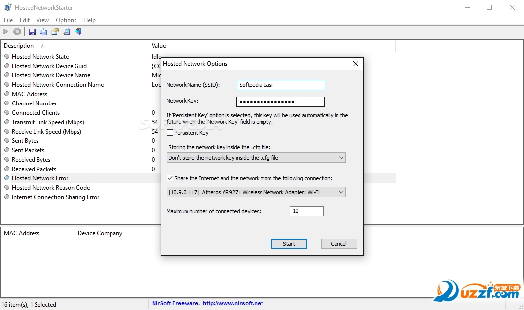 网络状态,随着设备的GUID和名称,MAC地址,通道数和一些统计数据的传输速度,传输的数据量,或所连接的客户数量在hostednetworkstarter主窗口显示。