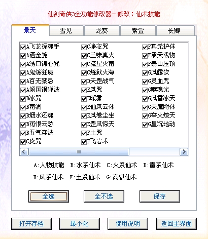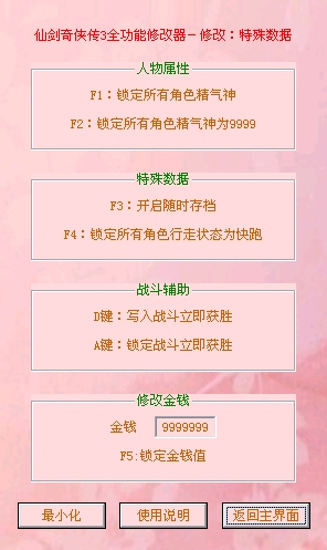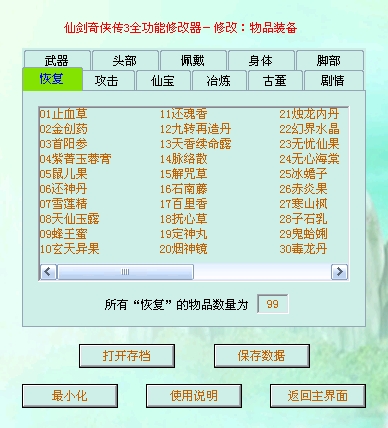 仙剑奇侠传3全功能修改器可修改人物属性、物品装备、仙术技能、特殊数据,做全攻能修改器很累的,原因是数据太多,尤其是物品装备,数据很多